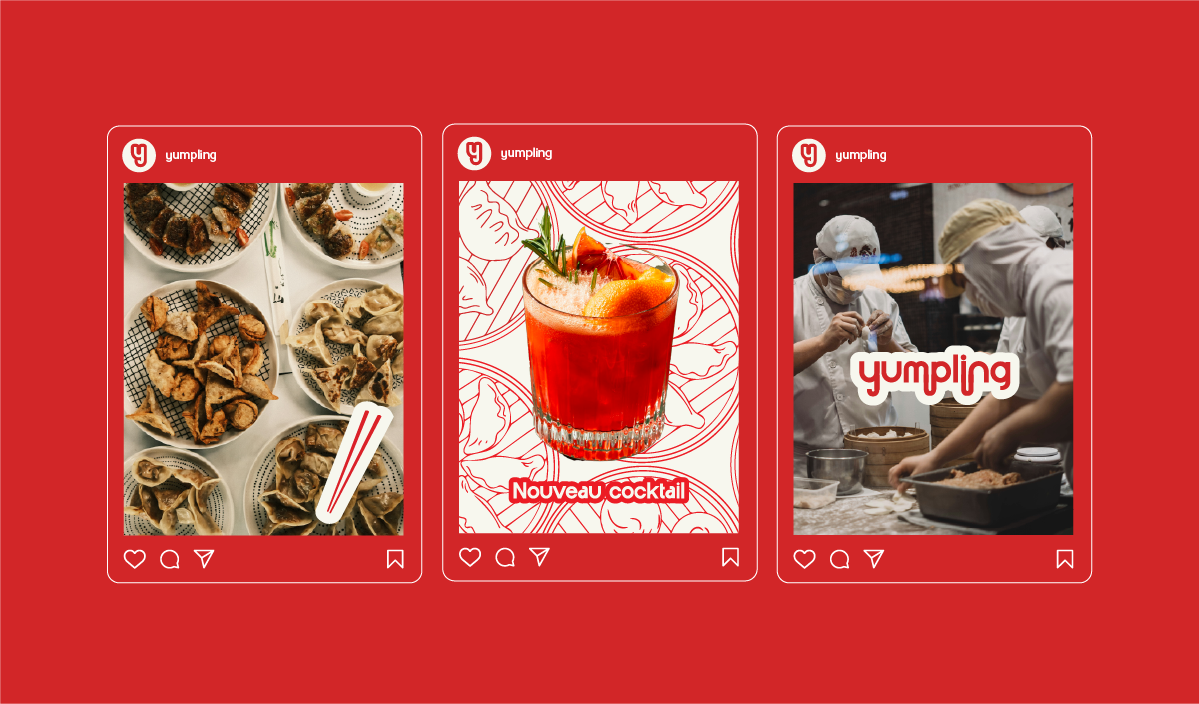Yumpling est un restaurant asiatique spécialisé en dumplings et cocktails. L’objectif était de développer une nouvelle identité visuelle à la fois dynamique et structurée. L’identité a été pensée pour refléter une ambiance chaleureuse, vibrante et moderne tout en reflétant l’expérience offerte par le restaurant. Des éléments graphiques ont également été créés afin d’ajouter de la personnalité à la marque et de permettre au client d’enrichir son contenu sur les réseaux sociaux. Il s’agit d’un projet fictif réalisé dans un contexte académique.